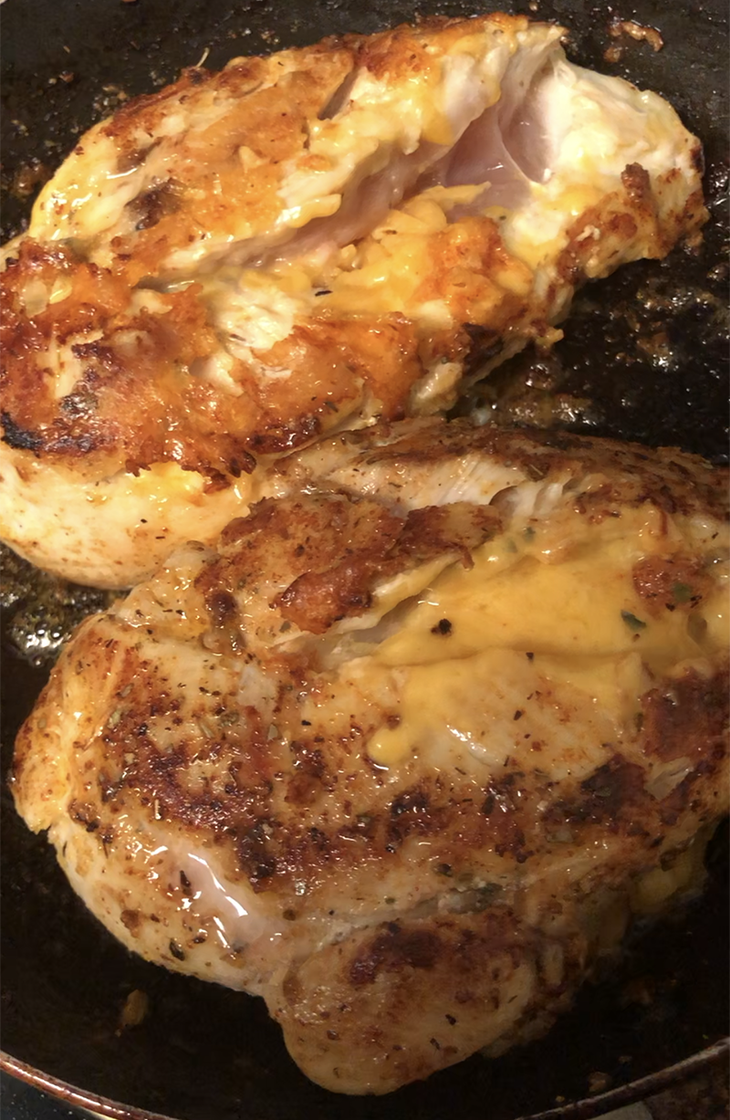 Placed the seasoned and cheddar stuffed chicken in the same pan that was used to cook down the veggies. Spray pan with some olive oil, Place on medium heat and pan sear on each side until crispy brown (5-7mins).